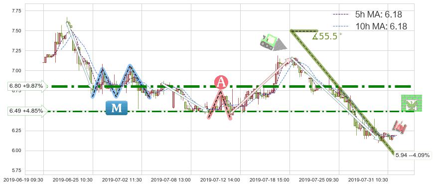 ♘ 阻力价格位6.80,可信任强度89.97%,距离最后交易2019-07-31 15:00形成的收盘价格6.19相差 +9.87%
