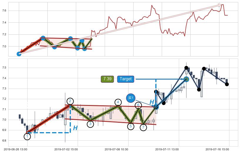从2019-07-16 14:00至2019-07-25 15:00,共包含44个小时,阶段股价上涨3.39%,阶段股价变动位移路程比: 1 : 7