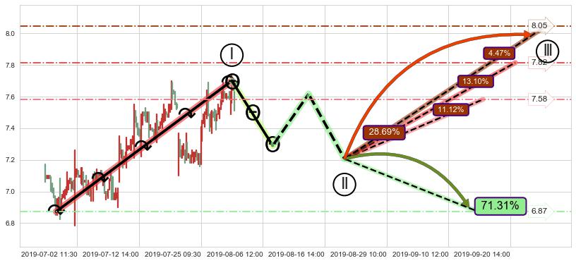 ➢ 循环浪继续向上【最低】位置(09-17:10, 7.58),匹配聚类样本比例38.75%, 可能性概率11.12%
