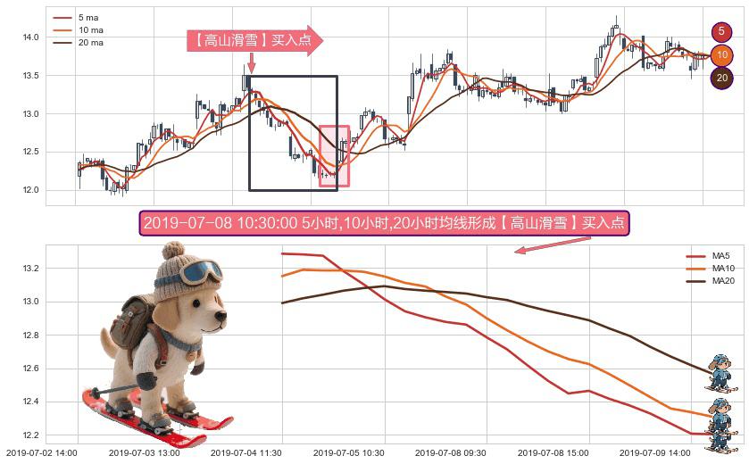 形态多维评估: ⚀ 2019-07-04 11:30:00小时-2019-07-09 15:00:00小时显现 5小时-10小时-20小时均线 【高山滑雪】买入点 看多信号,后市看涨,买入