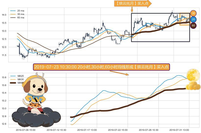 形态多维评估: ⚀ 2019-07-12 14:00:00小时-2019-07-31 14:00:00小时显现 20小时-30小时-60小时均线 【烘云托月】买入点 看多信号,后市看涨,买入