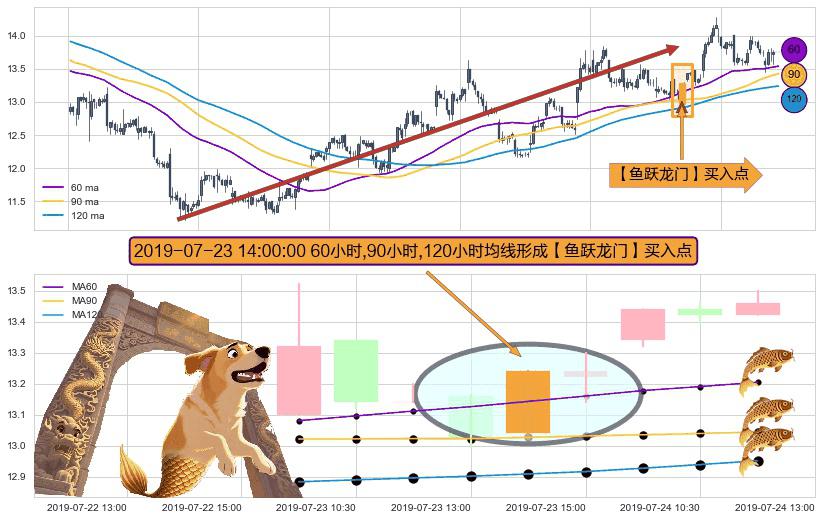 形态多维评估: ⚀ 2019-07-23 14:00:00小时显现 60小时-90小时-120小时均线 【鱼跃龙门】买入点 看多信号,后市看涨,买入