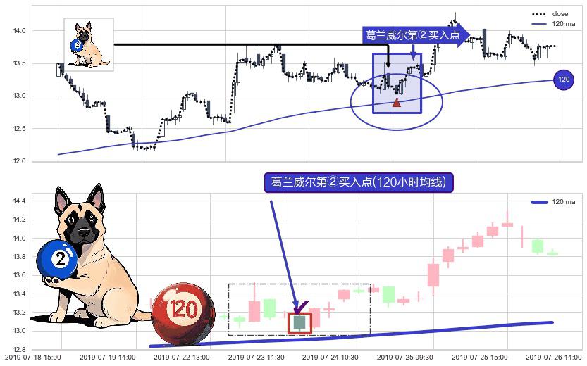 形态多维评估: ⚀ 2019-07-23 13:00:00-小时显现 葛兰威尔均线 120小时均线 第②买入点 上升趋势的中继信号,后市看涨,买进信号