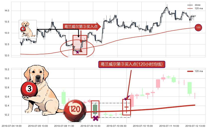 形态多维评估: ⚀ 2019-07-10 09:30:00-小时显现 葛兰威尔均线 120小时均线 第③买入点 上升趋势的中继信号,后市看涨,买进信号