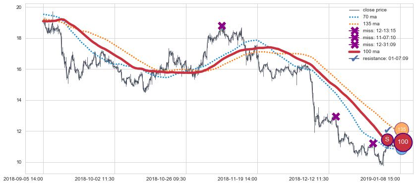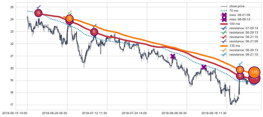 下跌趋势04-17 10:30-06-18 10:30,均线100, 70, 135确认关键阻力5处