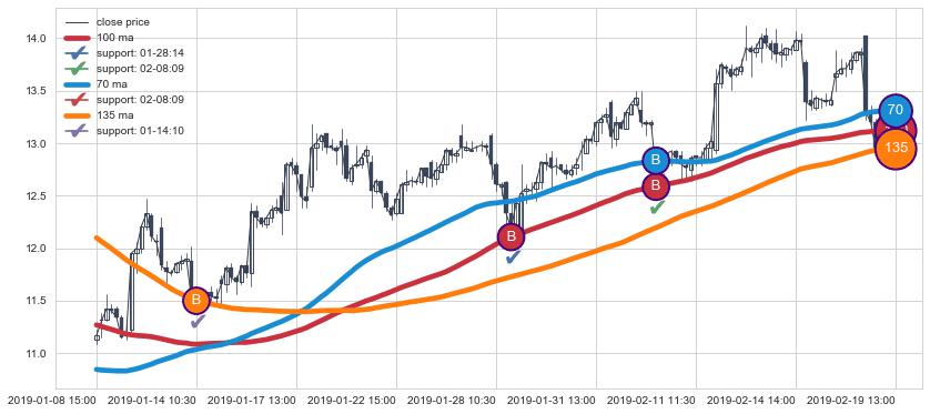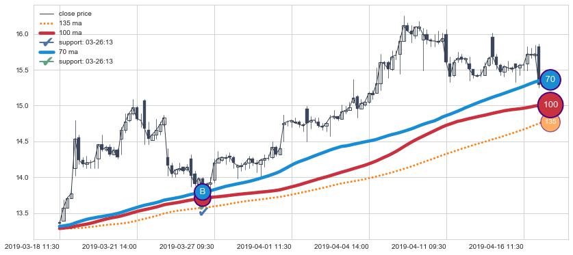 上涨趋势01-08 15:00-02-19 13:00,均线100, 70, 135确认关键支撑3处
