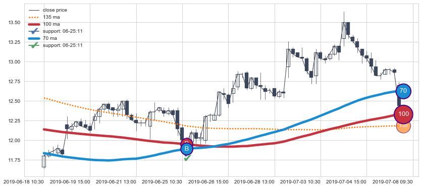 上涨趋势06-18 10:30-07-08 09:30,均线100, 70确认关键支撑1处