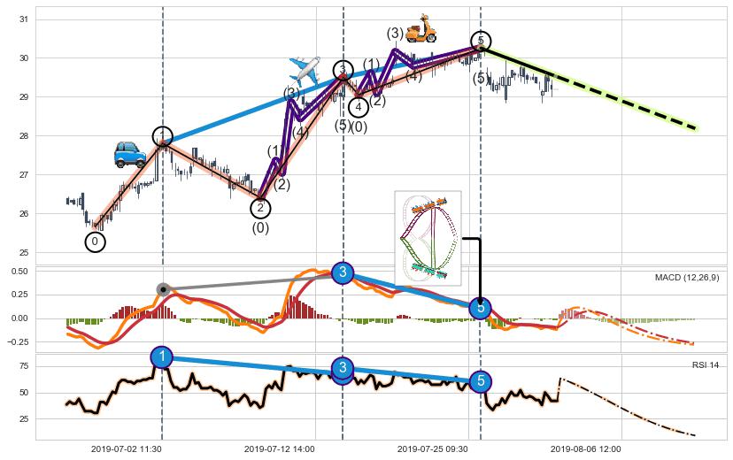 ➣ 突破缺口形成后,后续k已经超过14根,跳空突破波浪理论(5浪)关键点后, 出现【轻微回踩】迹象,短期高点影线回补缺口第二根k线高点