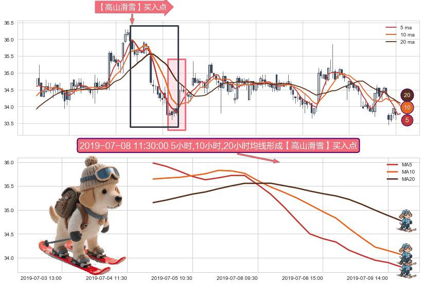 形态多维评估: ⚀ 2019-07-04 14:00:00小时-2019-07-09 15:00:00小时显现 5小时-10小时-20小时均线 【高山滑雪】买入点 看多信号,后市看涨,买入
