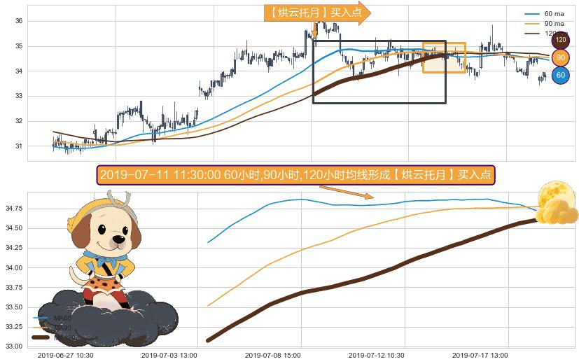 形态多维评估: ⚀ 2019-07-03 15:00:00小时-2019-07-18 15:00:00小时显现 60小时-90小时-120小时均线 【烘云托月】买入点 看多信号,后市看涨,买入
