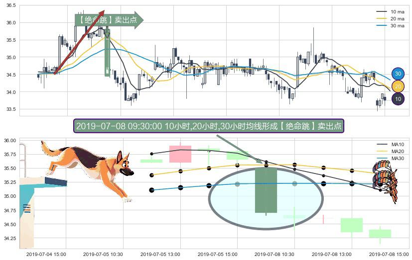 形态多维评估: ⚀ 2019-07-08 09:30:00小时显现 10小时-20小时-30小时均线 【绝命跳】卖出点 看空信号,后市看跌,卖出