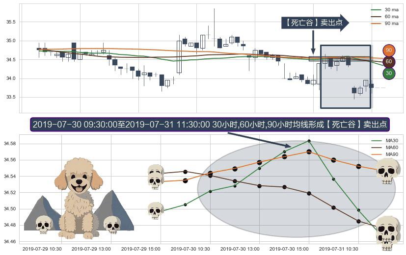 形态多维评估: ⚀ 2019-07-30 10:30:00-小时至2019-07-31 11:30:00-小时显现 30小时-60小时-90小时均线 【死亡谷】卖出点 看空信号,后市看跌,卖出