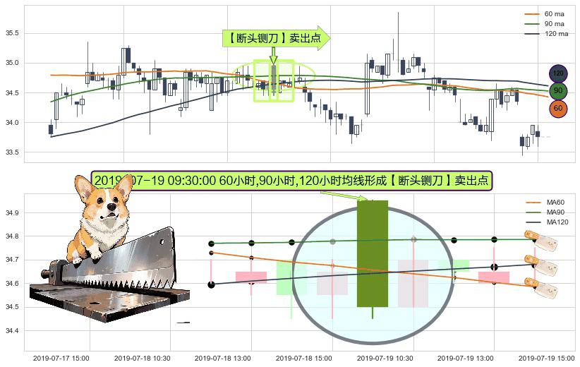 形态多维评估: ⚀ 2019-07-19 09:30:00小时显现 60小时-90小时-120小时均线 【断头铡刀】卖出点 看空信号,后市看跌,卖出