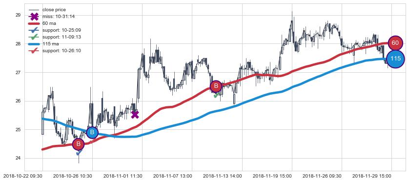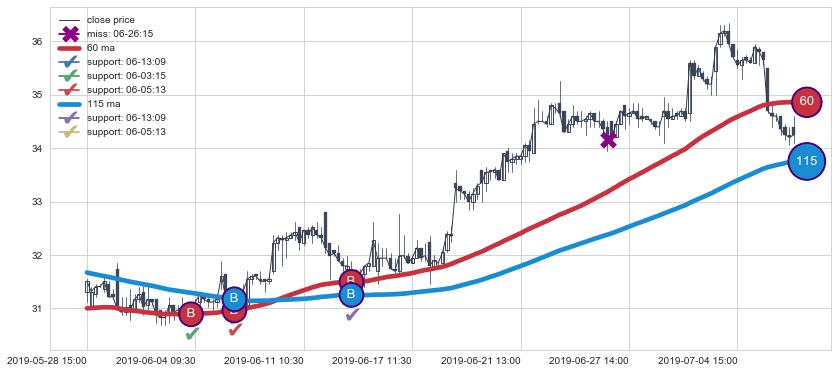上涨趋势05-28 15:00-07-09 09:30,均线115, 60确认关键支撑3处