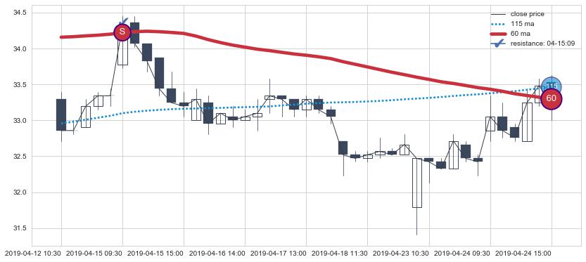 下跌趋势04-24 11:30-06-04 10:30,均线115, 60确认关键阻力4处