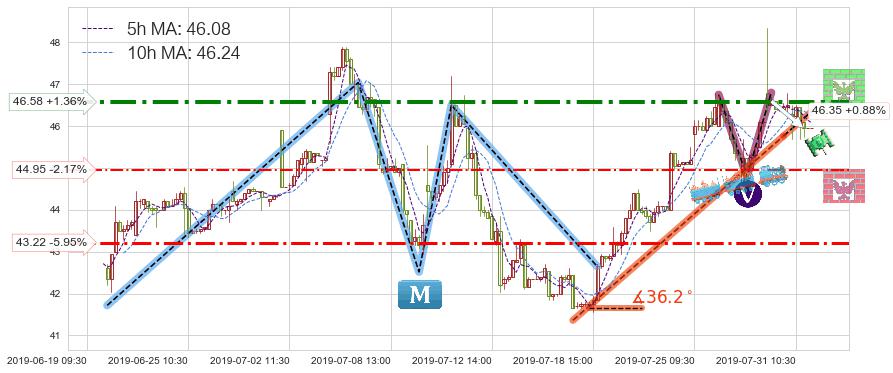 ♘ 阻力价格位46.58,可信任强度74.22%,距离最后交易2019-07-31 15:00形成的收盘价格45.95相差 +1.36%