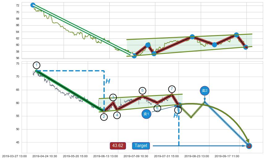 从2019-04-03 15:00至2019-05-31 15:00,共包含223个小时,阶段股价下跌-23.87%,阶段股价变动位移路程比: 1 : 3