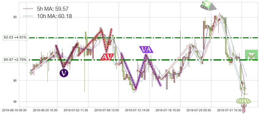 ♘ 阻力价格位62.03,可信任强度64.27%,距离最后交易2019-07-31 15:00形成的收盘价格59.35相差 +4.51%