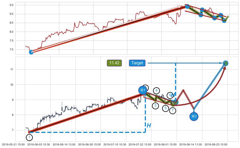 从2019-06-11 10:30至2019-06-24 09:30,共包含54个小时,阶段股价上涨1.93%,阶段股价变动位移路程比: 1 : 15