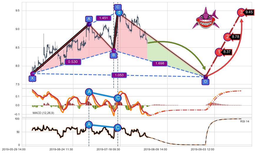 ➢ 距离预测D点位置尚有下跌空间,短线依然【看跌】, 耐心等待看涨【鲨鱼】形态反转启动