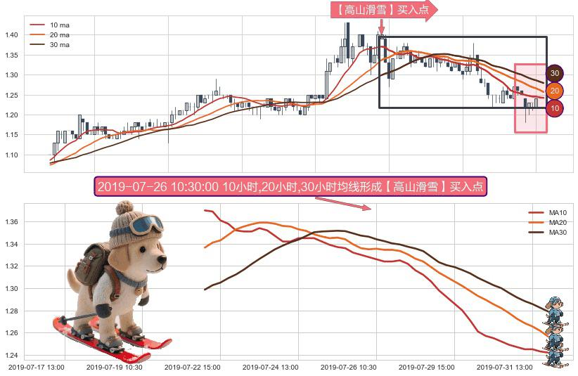 ⚀ 2019-07-22 13:00:00小时-2019-07-31 15:00:00小时显现 10小时-20小时-30小时均线 【高山滑雪】买入点 看多信号,后市看涨,买入