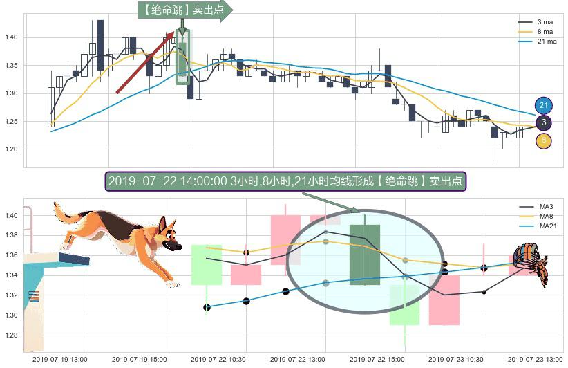 ⚀ 2019-07-22 14:00:00小时显现 3小时-8小时-21小时均线 【绝命跳】卖出点 看空信号,后市看跌,卖出