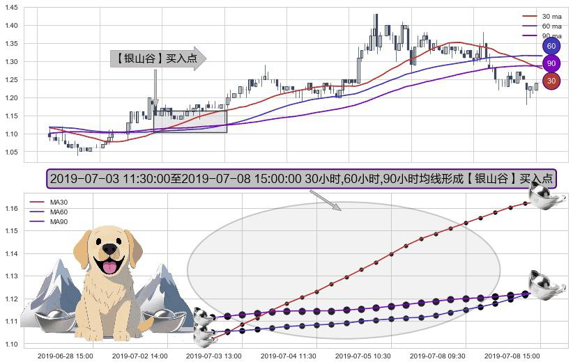 ⚀ 2019-07-03 13:00:00-小时至2019-07-08 15:00:00-小时显现 30小时-60小时-90小时均线 【银山谷】买入点 看多信号,后市看涨,买入