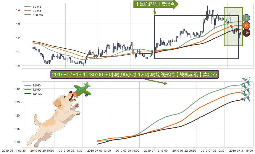 ⚀ 2019-06-28 13:00:00小时-2019-07-30 15:00:00小时显现 60小时-90小时-120小时均线 【战机起航】卖出点 看空信号,后市看跌,卖出