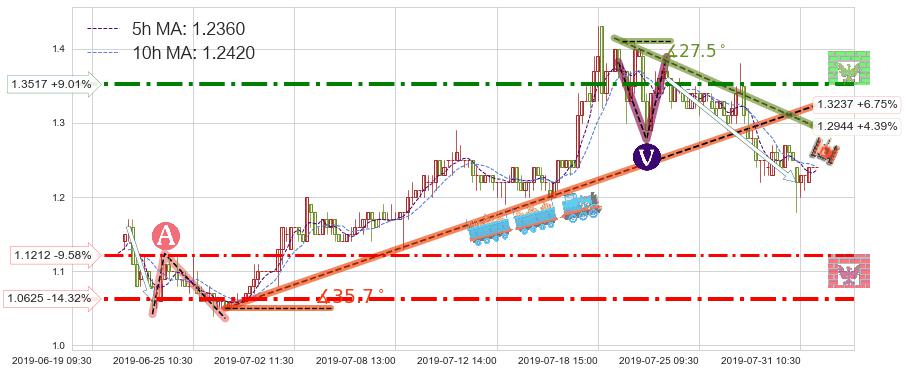 从2019-07-19 13:00至2019-07-31 14:00,共包含50个小时,阶段股价下跌-11.42%,阶段股价变动位移路程比: 1 : 5,下跌趋势角度: 27.5