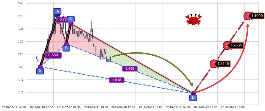 ➢ 距离预测D点位置有足够的下跌空间, 与看涨【螃蟹】形态相反,实际方向【看跌】