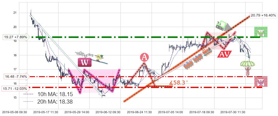 ♘ 阻力价格位19.27,可信任强度90.87%,距离最后交易2019-07-31 15:00形成的收盘价格17.86相差 +7.89%
