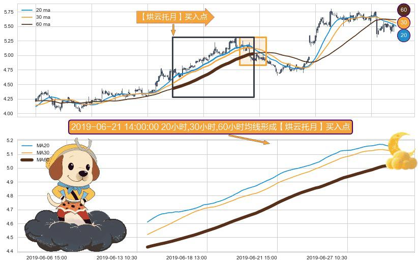 ⚀ 2019-06-13 14:00:00小时-2019-07-02 13:00:00小时显现 20小时-30小时-60小时均线 【烘云托月】买入点 看多信号,后市看涨,买入