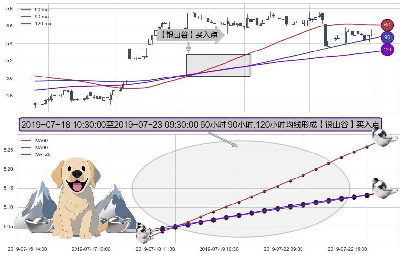 ⚀ 2019-07-18 11:30:00-小时至2019-07-23 09:30:00-小时显现 60小时-90小时-120小时均线 【银山谷】买入点 看多信号,后市看涨,买入