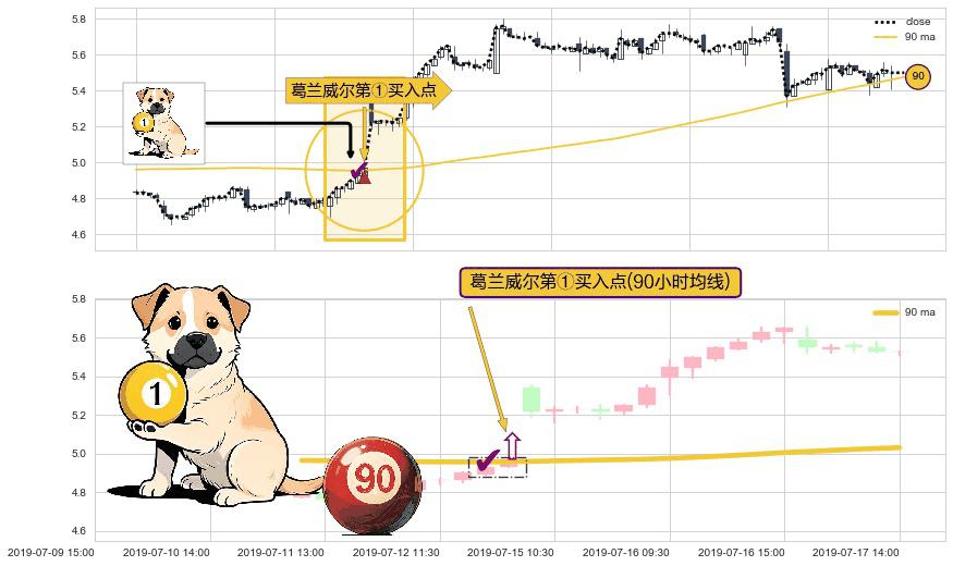 ⚀ 2019-07-12 15:00:00-小时显现 葛兰威尔均线 90小时均线 第买①入点 走势反转见底信号,后市看涨,买进信号
