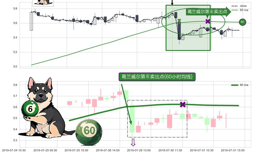 ⚀ 2019-07-29 09:30:00-小时显现 葛兰威尔均线 60小时均线 第⑥卖出点 走势反转见顶信号,后市看跌,卖出信号
