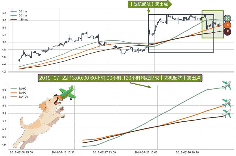 ⚀ 2019-07-12 15:00:00小时-2019-07-30 10:30:00小时显现 60小时-90小时-120小时均线 【战机起航】卖出点 看空信号,后市看跌,卖出
