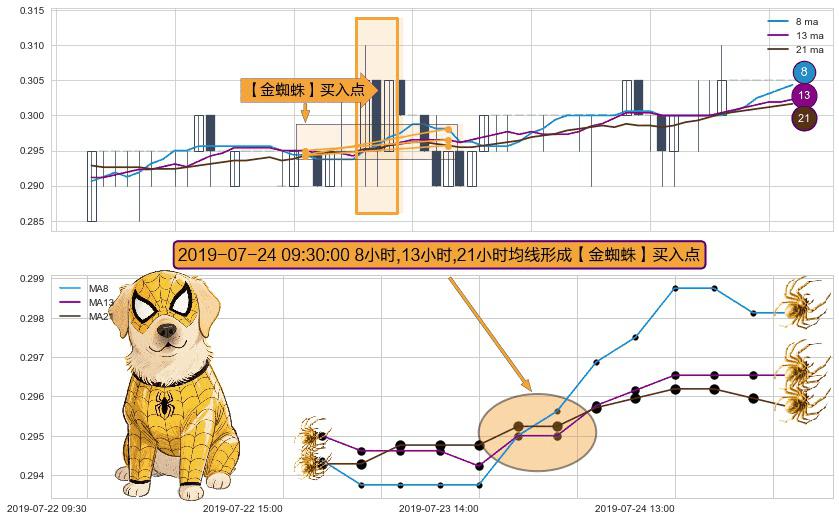 形态多维评估: ⚀ 2019-07-24 09:30:00小时显现 8小时-13小时-21小时均线 【金蜘蛛】买入点 看多信号,后市看涨,买入