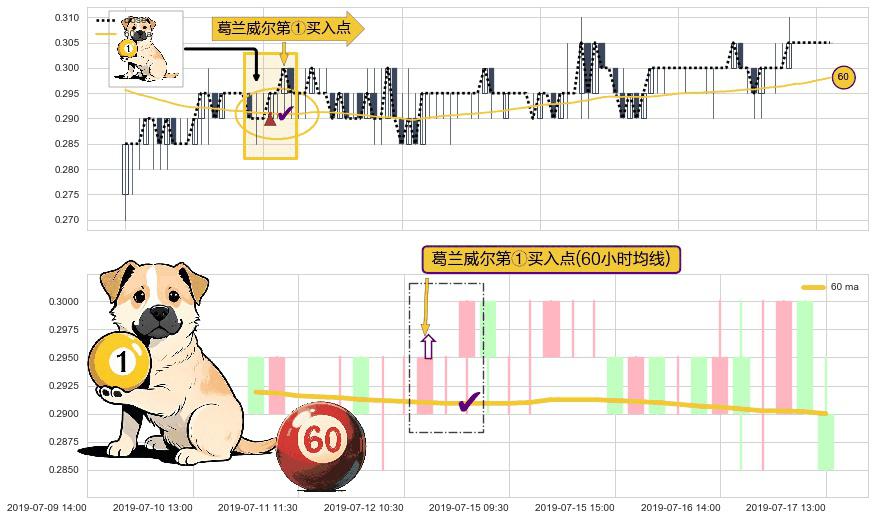 形态多维评估: ⚀ 2019-07-12 11:30:00-小时显现 葛兰威尔均线 60小时均线 第买①入点 走势反转见底信号,后市看涨,买进信号