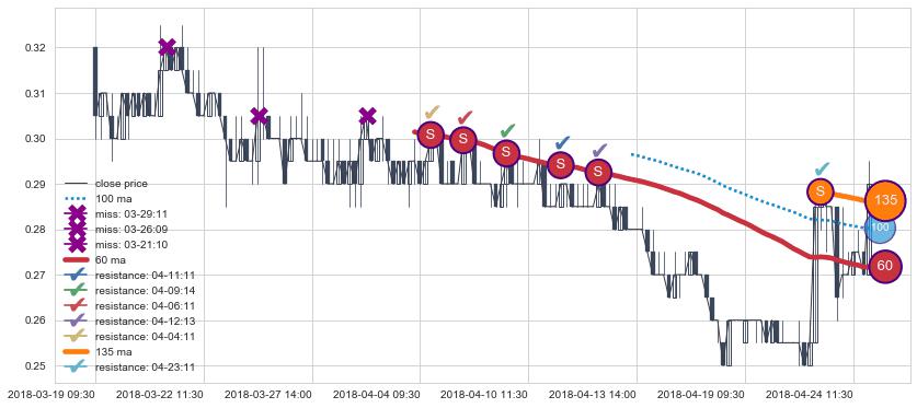 下跌趋势03-19 09:30-04-24 15:00,均线60, 135确认关键阻力6处