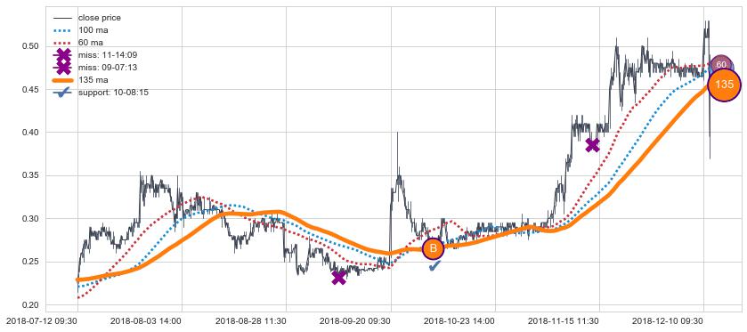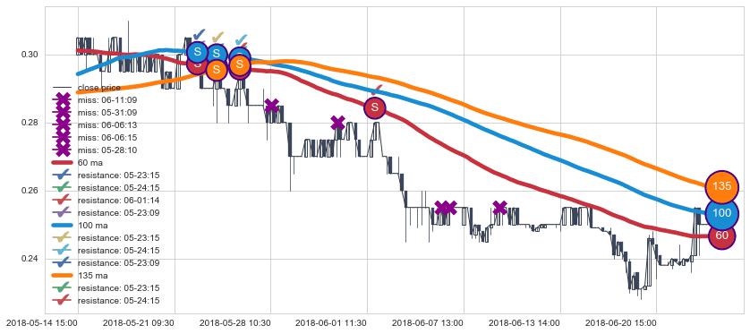 下跌趋势05-14 15:00-06-25 10:30,均线100, 60, 135确认关键阻力4处