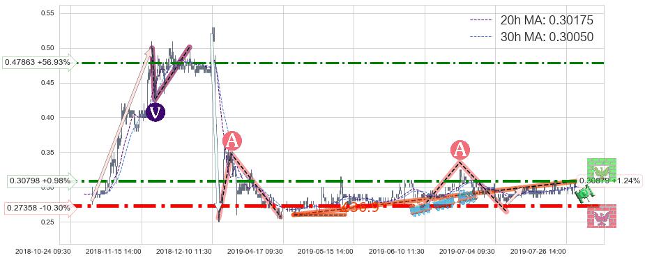 ✂️ 2019-04-23 13:00-2019-07-03 15:00上升趋势存在反转[风险],虽然原上升趋势的支撑位(0.30879)已破位,但其支撑效果尚存,原上升趋势角度: 36.9˚
