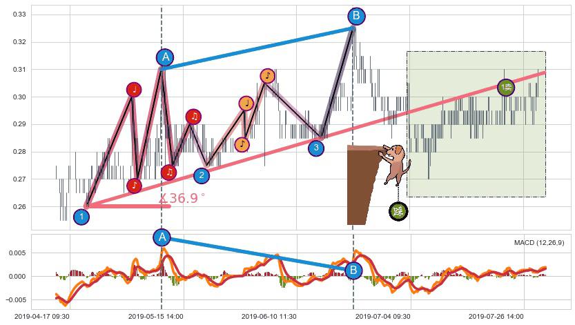➢ 最后的上涨趋势2019-04-23 13:00至2019-07-03 15:00:存在破位迹象,后续小调整或者反转下跌