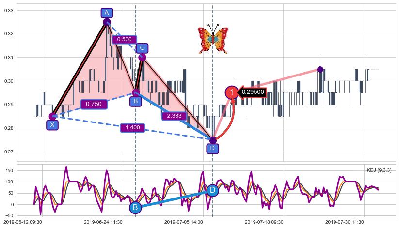 ➣ 已完成【蝴蝶】形态起点X: 06-13:09, 终点D: 07-08:14, 共101交易小时