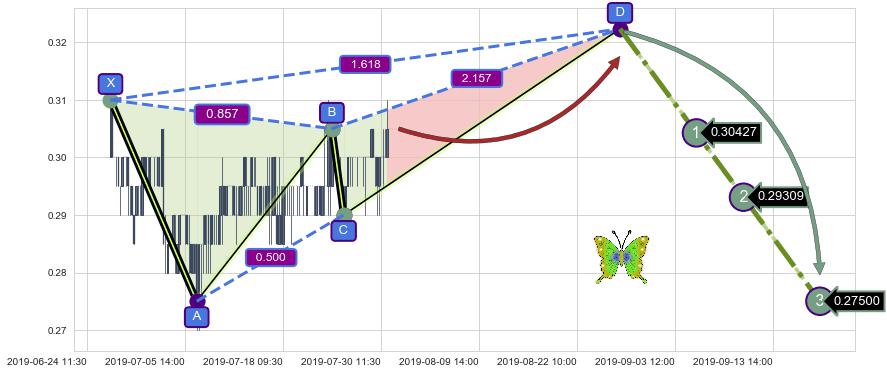 ➣ 未完成【蝴蝶】形态起点X: 06-26:11, 已到达C点: 07-25:10, 预测最终D点: 08-27:14, 共255交易小时