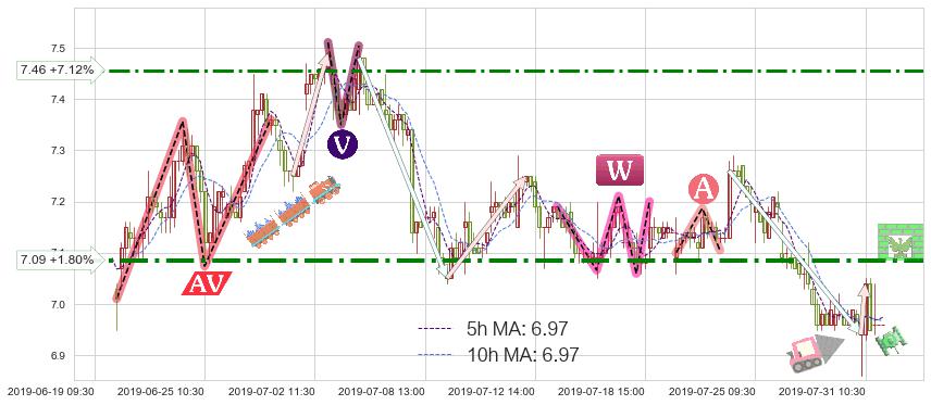 ♘ 阻力价格位7.46,可信任强度66.12%,距离最后交易2019-07-31 15:00形成的收盘价格6.96相差 +7.12%