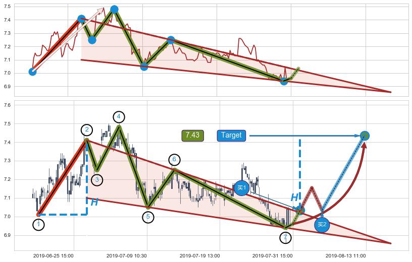 ➢ 最小中继整理跌幅→𝐇: 0.212857 (低点逐步抬高斜边第一支撑点②与阻力边垂直距离)