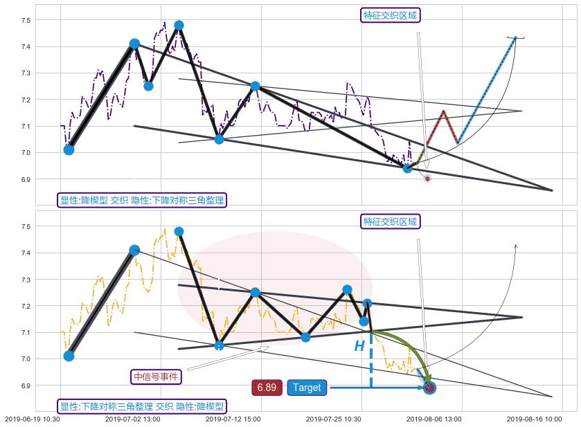 ➣ 【多空双方观望→争持→促使价格波动日益狭窄→空方打破攻守平衡点】对称三角形中继整理, 已在07-26:09突破【支撑】颈线 7.10 →演变成下降通道