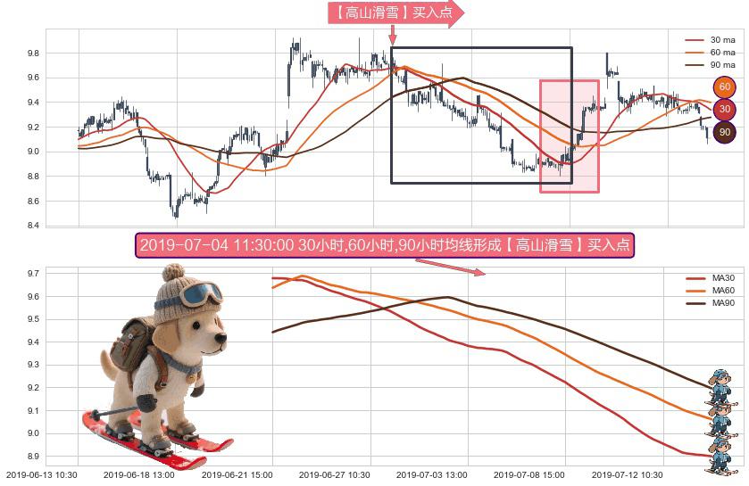 ⚀ 2019-06-21 15:00:00小时-2019-07-15 15:00:00小时显现 30小时-60小时-90小时均线 【高山滑雪】买入点 看多信号,后市看涨,买入