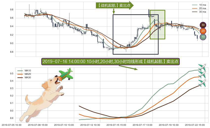 ⚀ 2019-07-10 15:00:00小时-2019-07-22 13:00:00小时显现 10小时-20小时-30小时均线 【战机起航】卖出点 看空信号,后市看跌,卖出