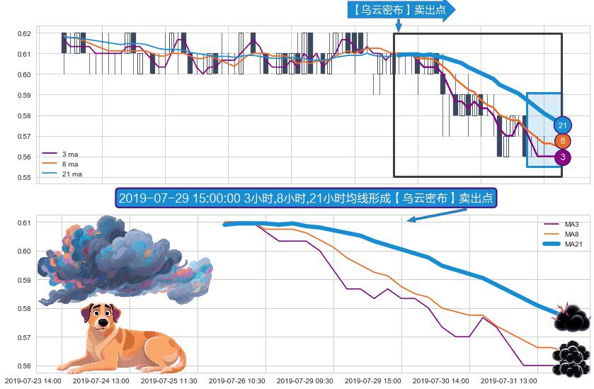 形态多维评估: ⚀ 2019-07-25 14:00:00小时-2019-07-31 15:00:00小时显现 3小时-8小时-21小时均线 【乌云密布】卖出点 看空信号,后市看跌,卖出